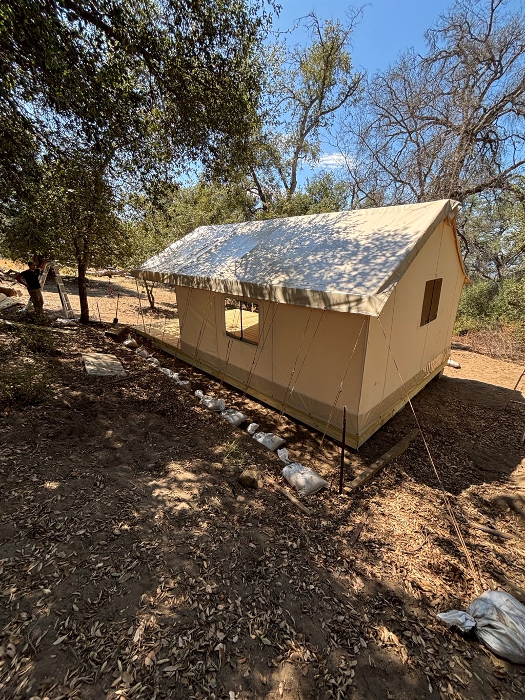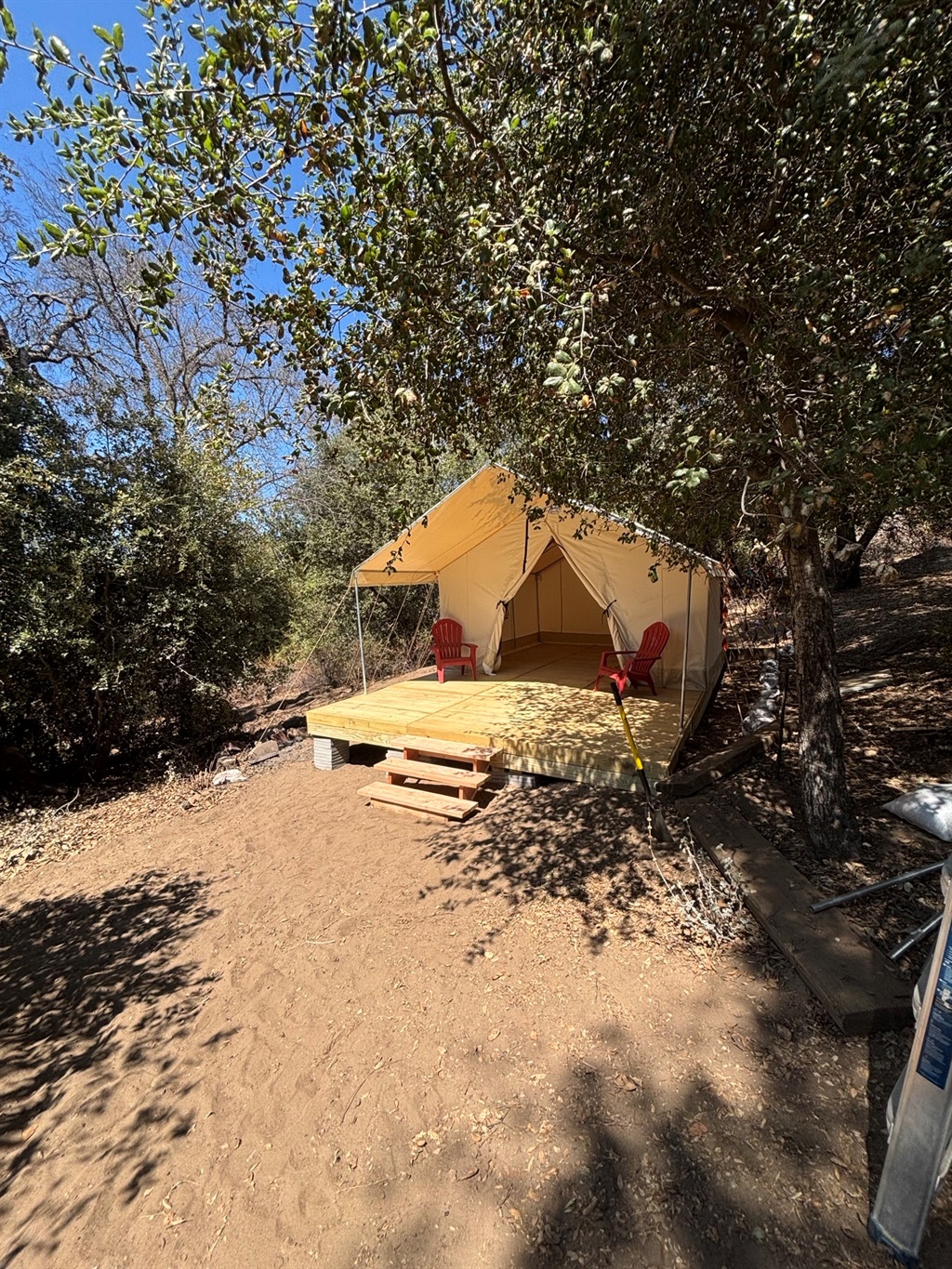 Inside, the wall tent features a comfortable queen bed with fresh linens and soft lighting that creates a calm, relaxing atmosphere. Step outside and breathe in the crisp mountain air, surrounded by towering oak trees and sweeping views that stretch across the valley — and on clear days, all the way to the Pacific Ocean.