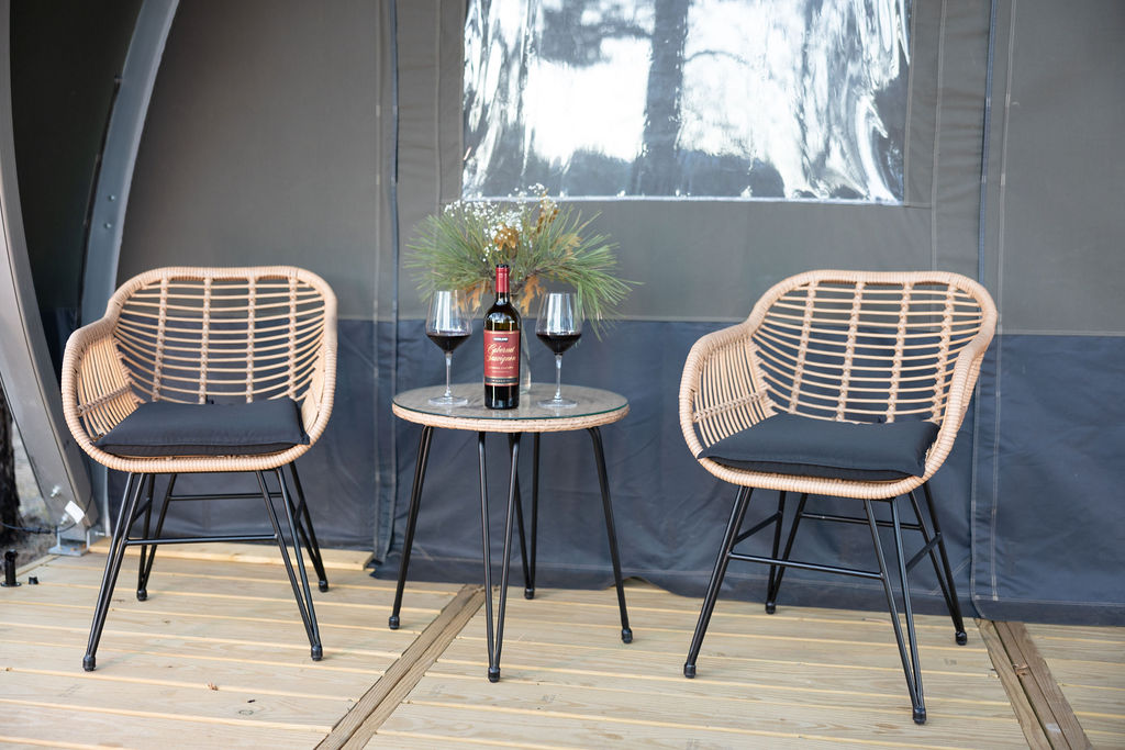 Your tent offers the charm of camping with the ease of a cozy hideaway. Thoughtfully furnished with a plush king bed, fresh linens, heating, AC, and electrical outlets, it’s the perfect place to rest under star-filled skies without giving up modern comforts. Step outside each morning to crisp mountain air, birdsong, and the scent of Ponderosa pines — a refreshing change of pace from the busy world.