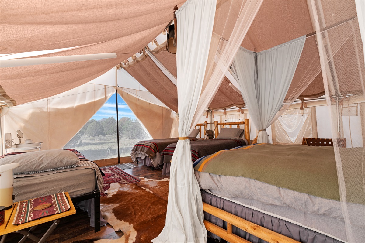 1 Bedroom • 1 Bathroom 1 Bath • Sleeps 1-5Experience a true nature escape with your family at Arizona Luxury Expeditions. Our safari-style wall tent is located on 30 private, secluded acres just 30 minutes from the Grand Canyon. Your family will have plenty of space with one queen and three twin beds, all outfitted with real beds, flannel sheets, and thick wool blankets for a comfortable stay.