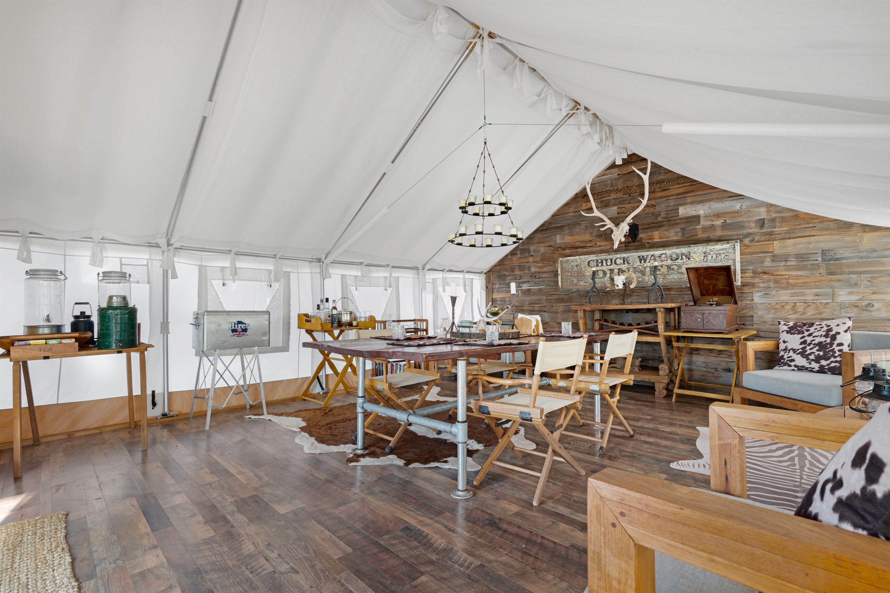 This well-appointed wall tent includes a queen bed and three twin beds, along with essential amenities like lighting, heating, flashlights, and phone chargers to make your off-grid stay seamless and stress-free.