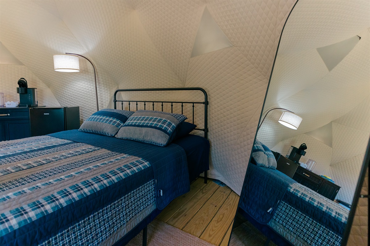 Surrounded by trees and mountain views, this unique dome is designed for couples, solo travelers, or small families seeking an unforgettable glamping escape. Inside, you’ll find a cozy queen bed, with additional bedding available for kids or a third guest. Outside, unwind by your private firepit and enjoy peaceful evenings under the stars.