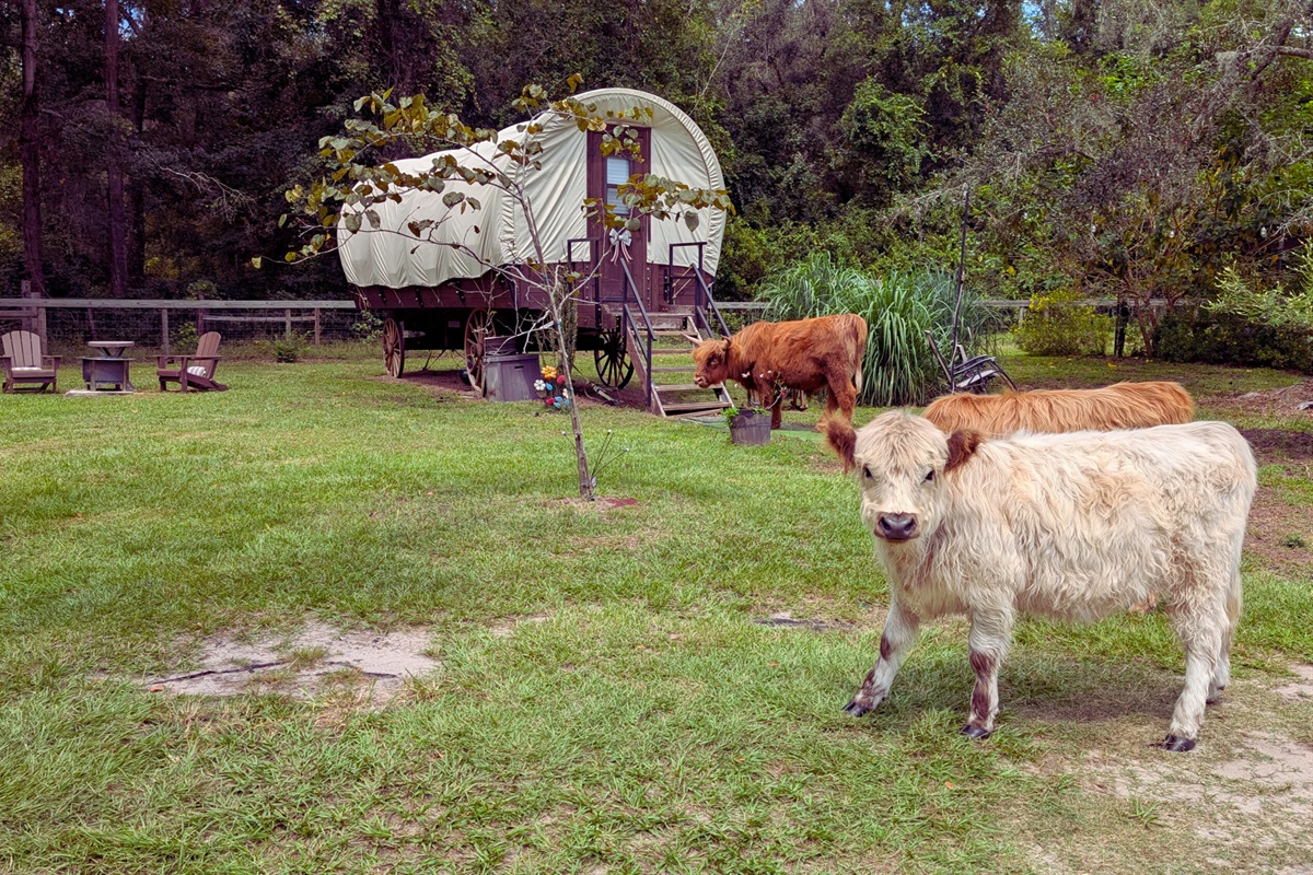 Peaceful King Bed Wagon with Highland Cows Luxury Covered Wagon on a Fluffy Cow Farm