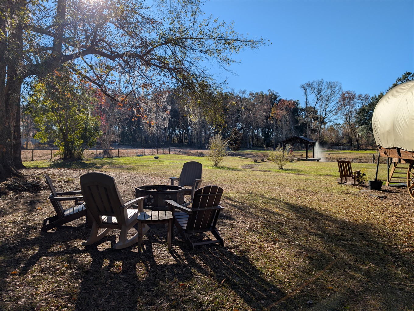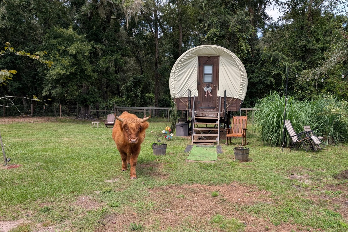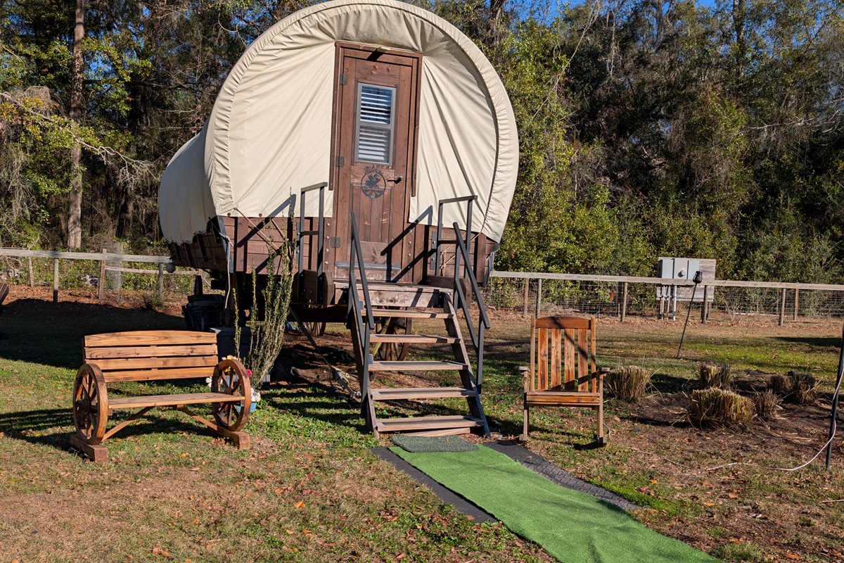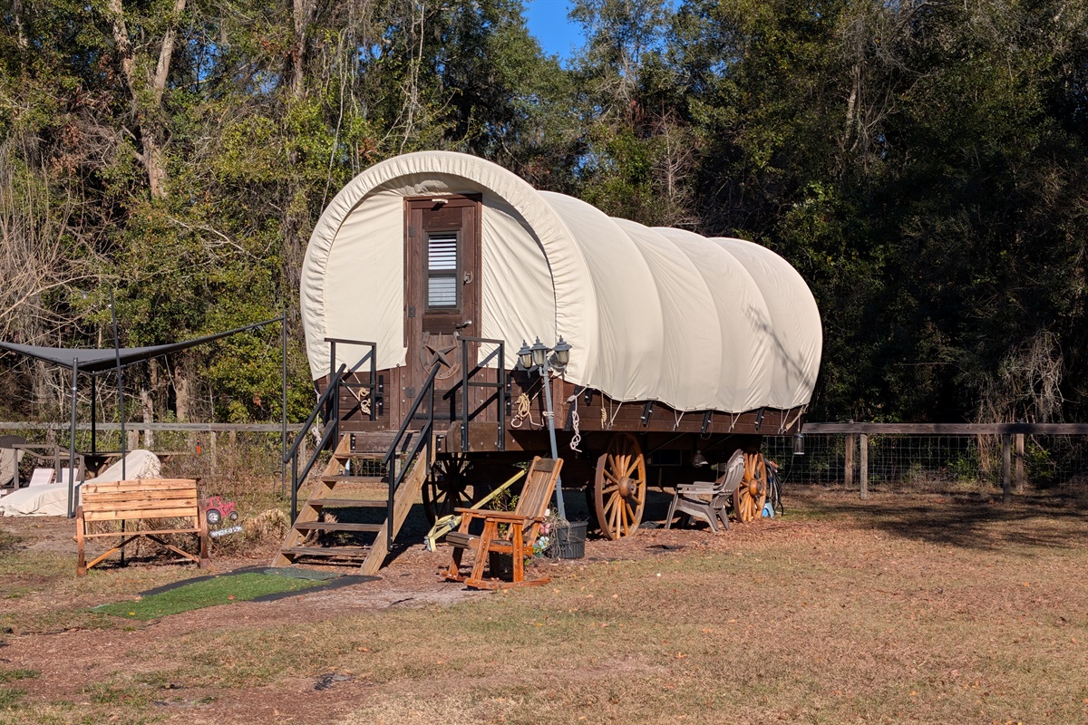 1 Bedroom • 1 Bathroom 1 Bath • Sleeps 1-2Welcome to an unforgettable stay where country charm, modern comfort, and animal magic come together. Our luxury covered wagon offers a truly unique glamping experience set on a peaceful animal sanctuary, surrounded by forests, ponds, pastures, and some of the friendliest farm animals you’ll ever meet.