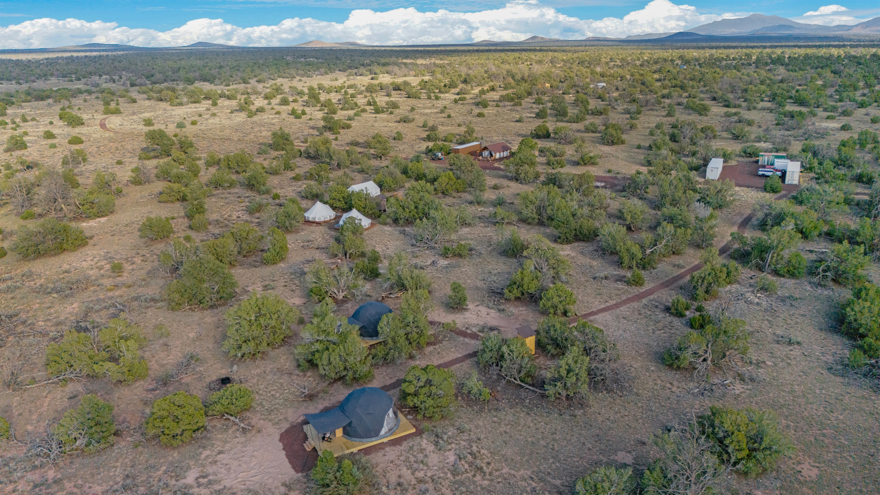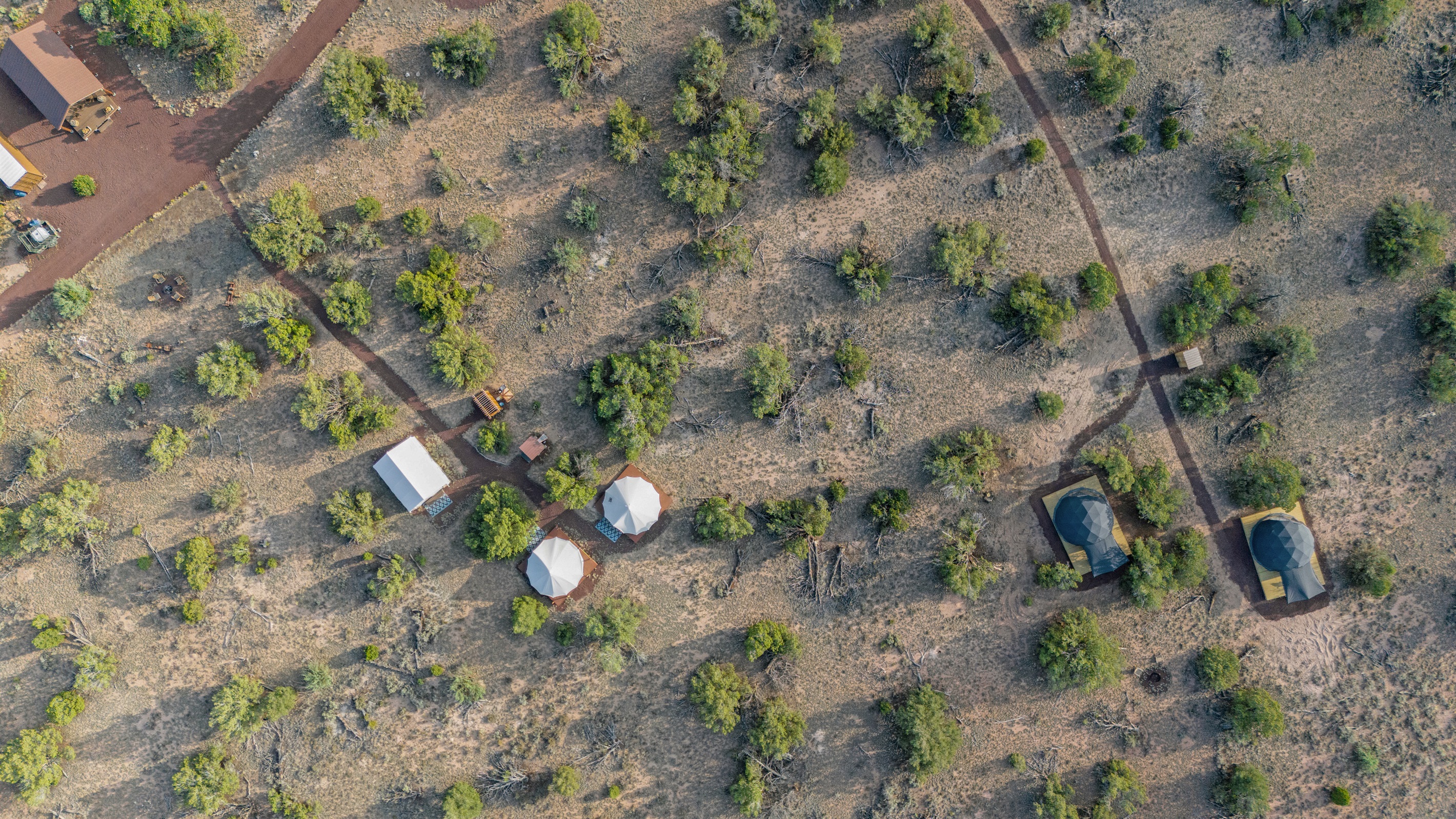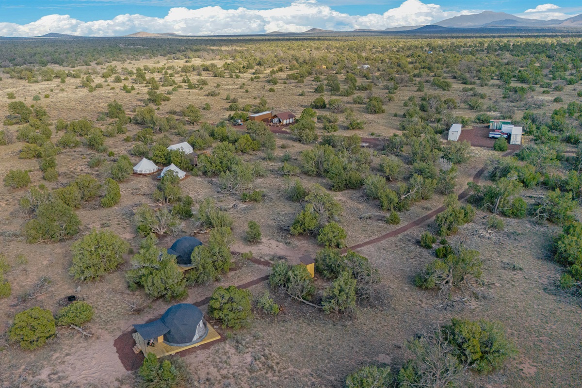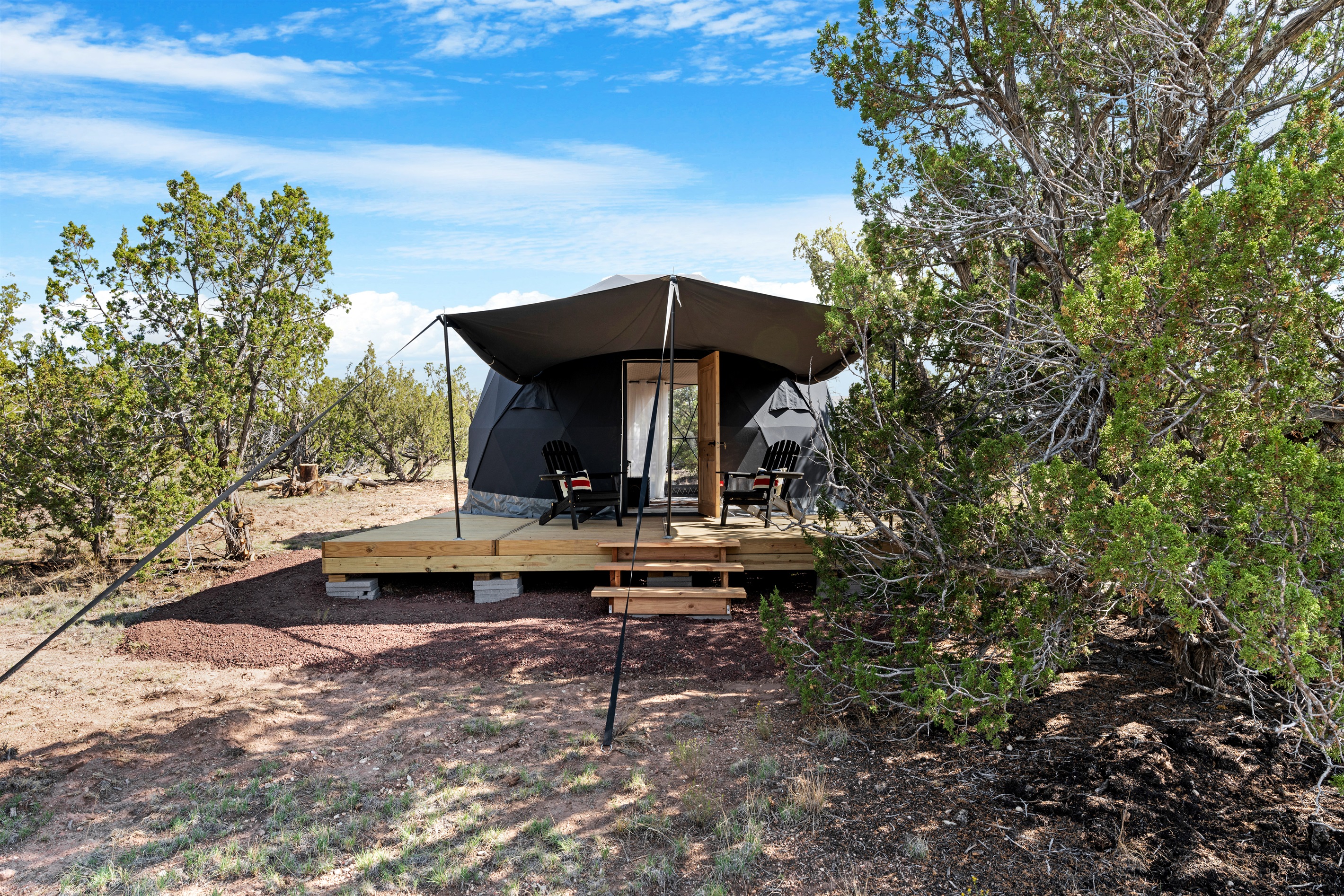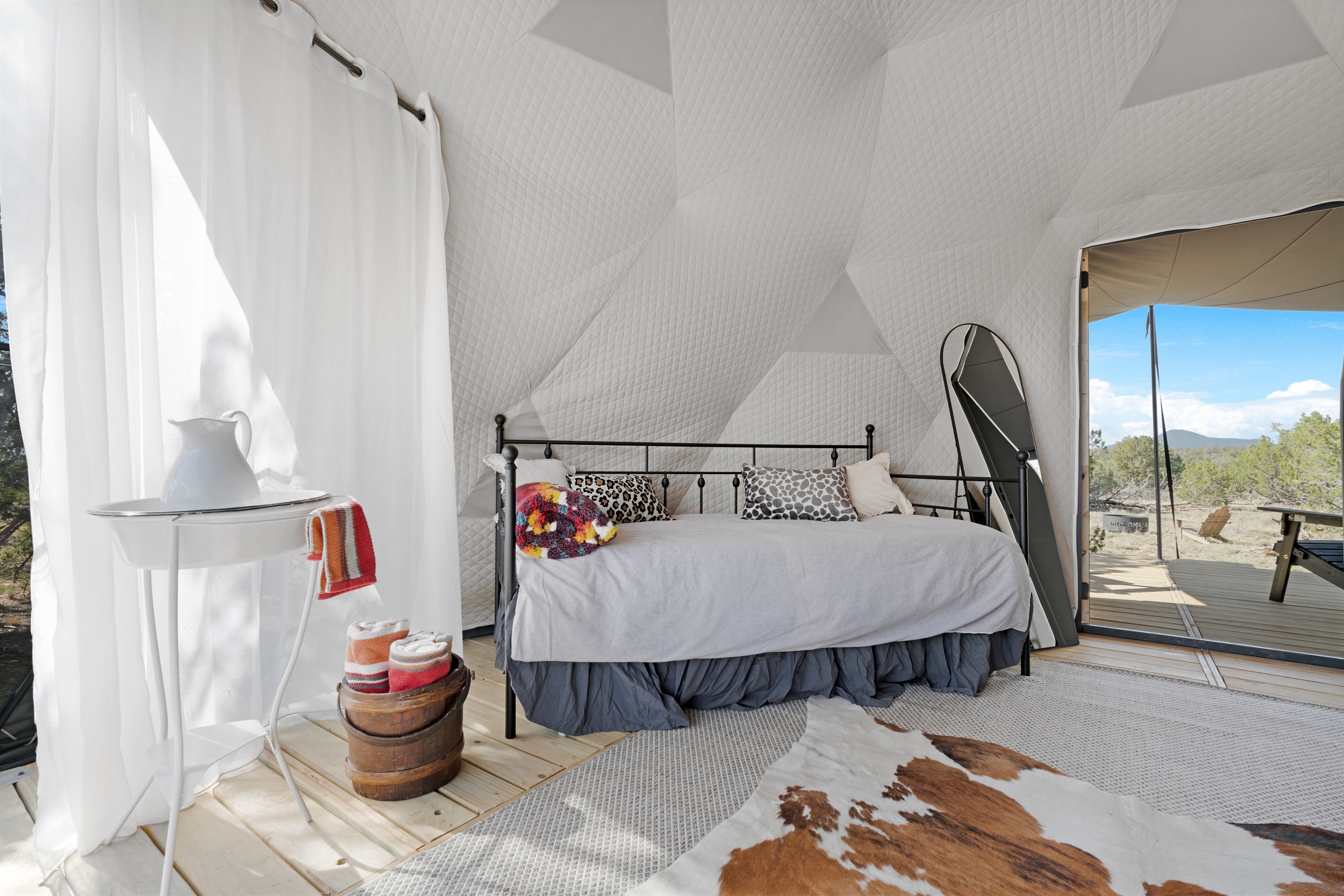 This spacious canvas dome sits on 30 acres of private land just 30 minutes from the Grand Canyon South Rim. The design features panoramic windows, inviting you to soak in endless desert skies, glowing sunsets, and breath-taking stargazing.
