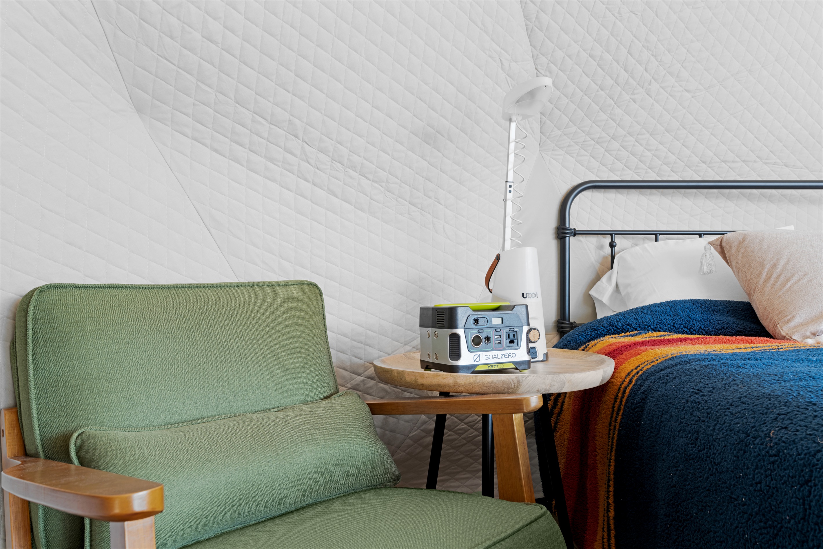 Dome 2 is styled with warm desert tones and cozy textures, creating a welcoming retreat after a day at the Grand Canyon. The centerpiece is a queen bed dressed in soft linens and a colorful Southwestern blanket, complemented by a twin daybed with a pull-out trundle—perfect for families or friends traveling together.