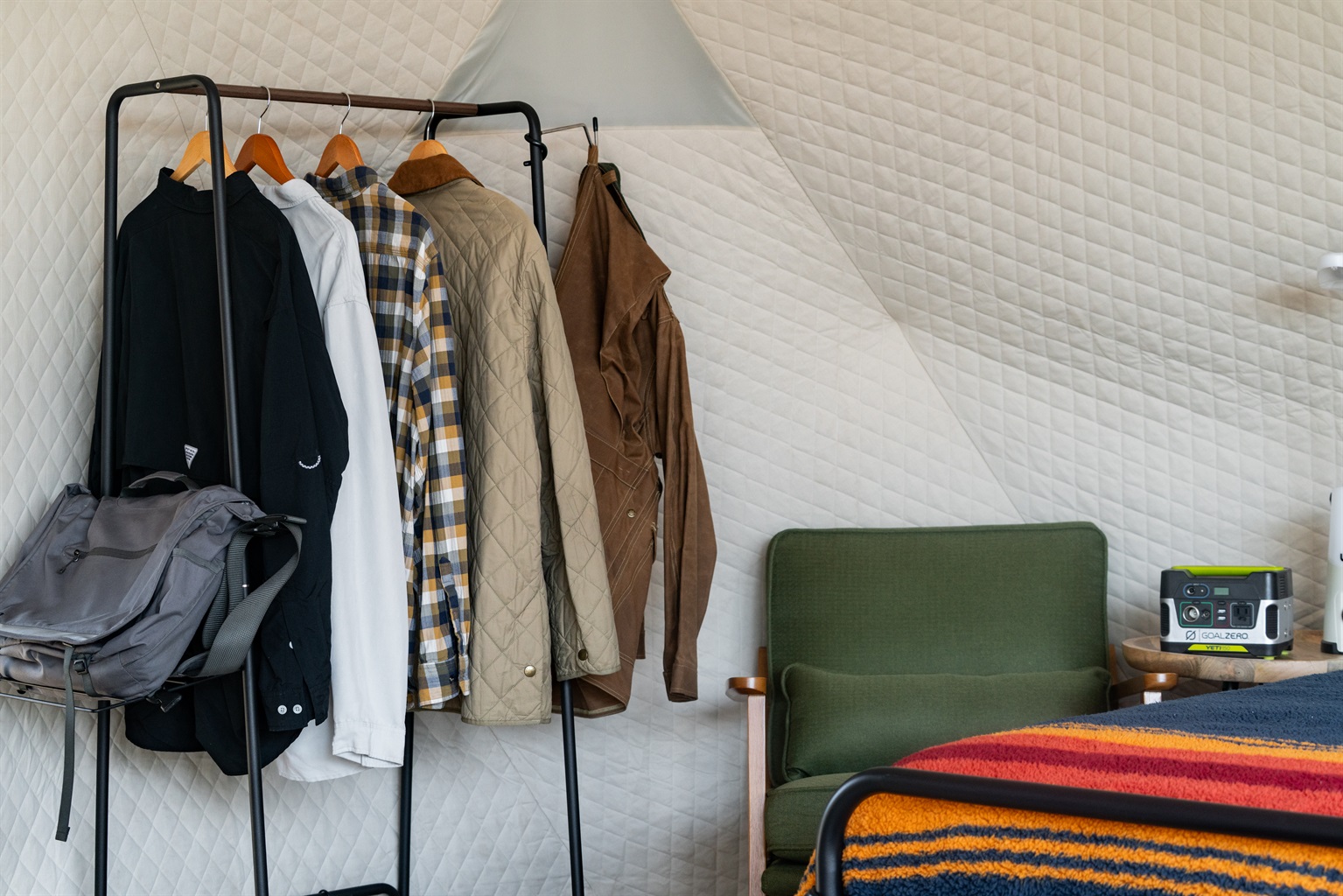 Natural light filters through the floor-to-ceiling curtains, brightening the spacious dome and highlighting details like the cowhide rug, wood floors, and woven textiles. A pair of chairs and a side table provide a comfortable sitting area, while a dresser and open wardrobe add convenient storage. The thoughtful layout balances rustic character with modern comfort, making the space both practical and inviting