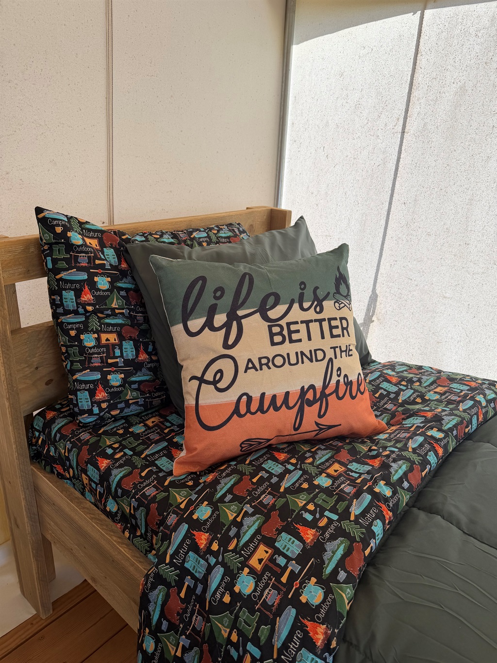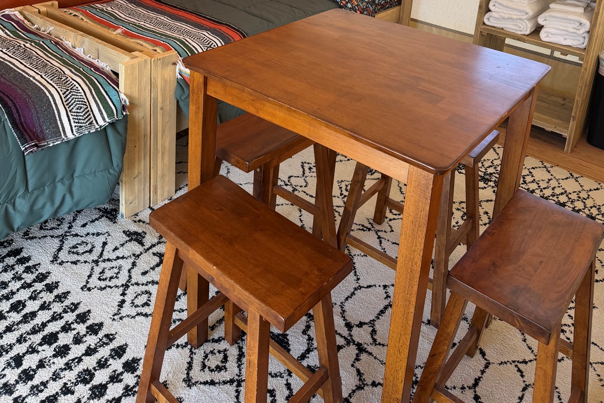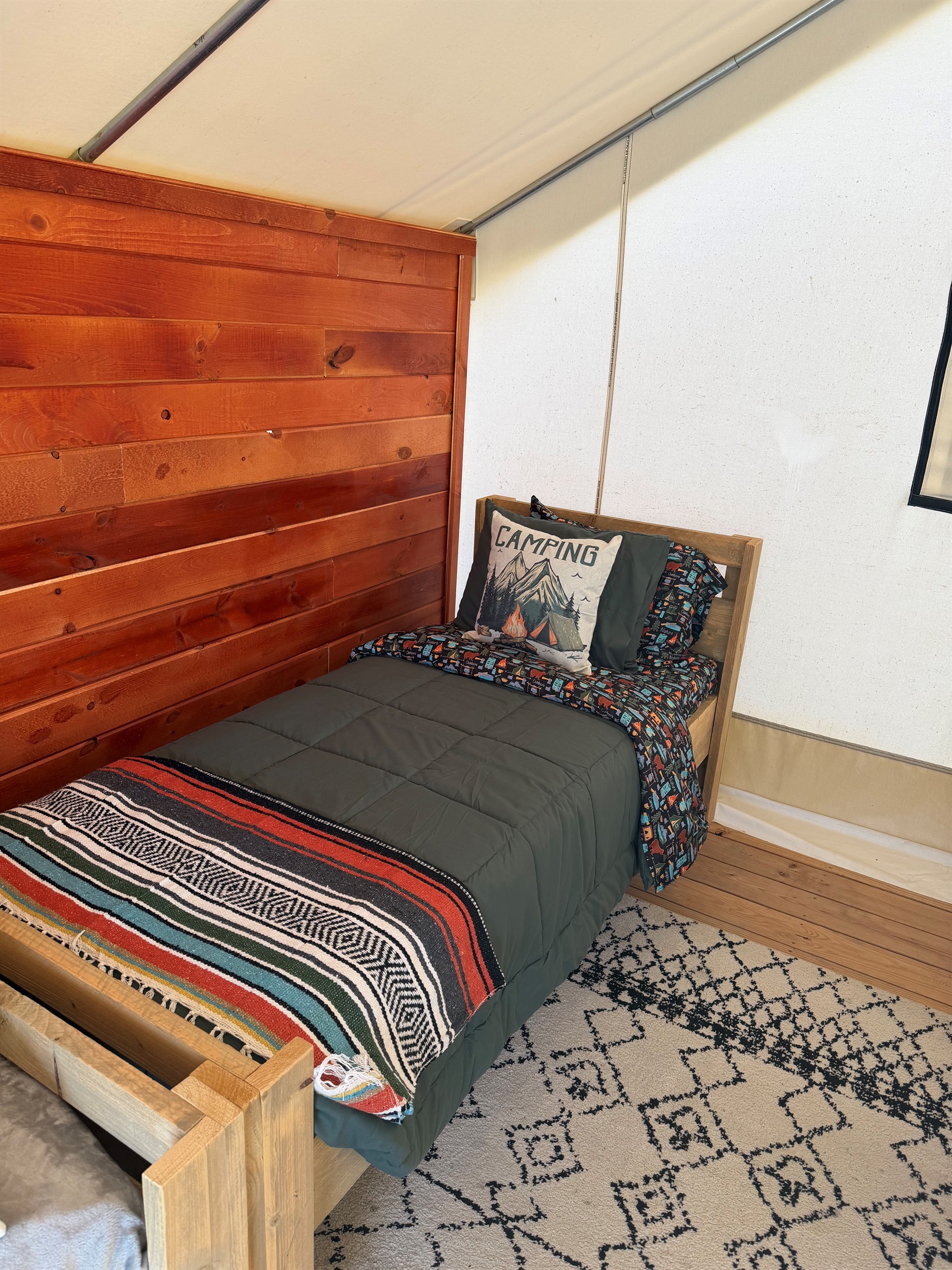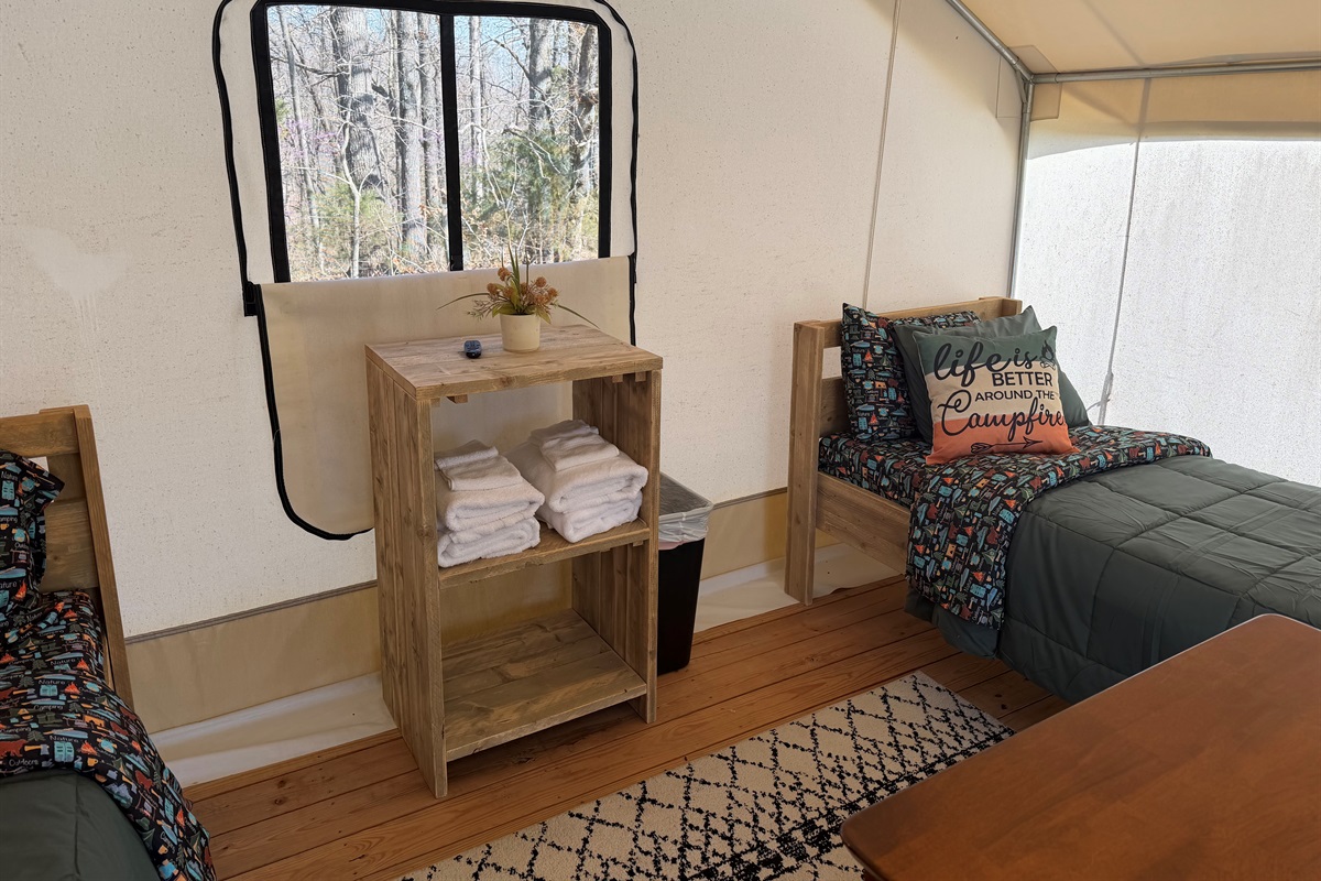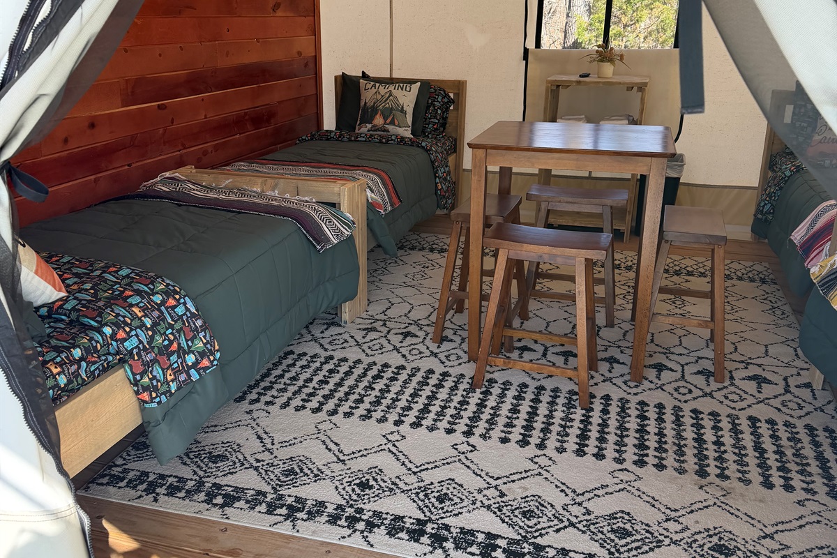 Tucked away in a more secluded area of the property, Glamping tent #1, ideal for couples, is one of our 5 larger glamping units that offer a peaceful off-grid retreat surrounded by trees, and the occasional visit from deer at sunrise. While there’s no power in the tent itself, you’ll find comfort in the simplicity - like four comfortable twin beds with a plush bed pad and a wood stove for warmth on cooler nights.