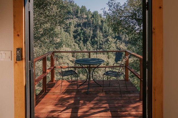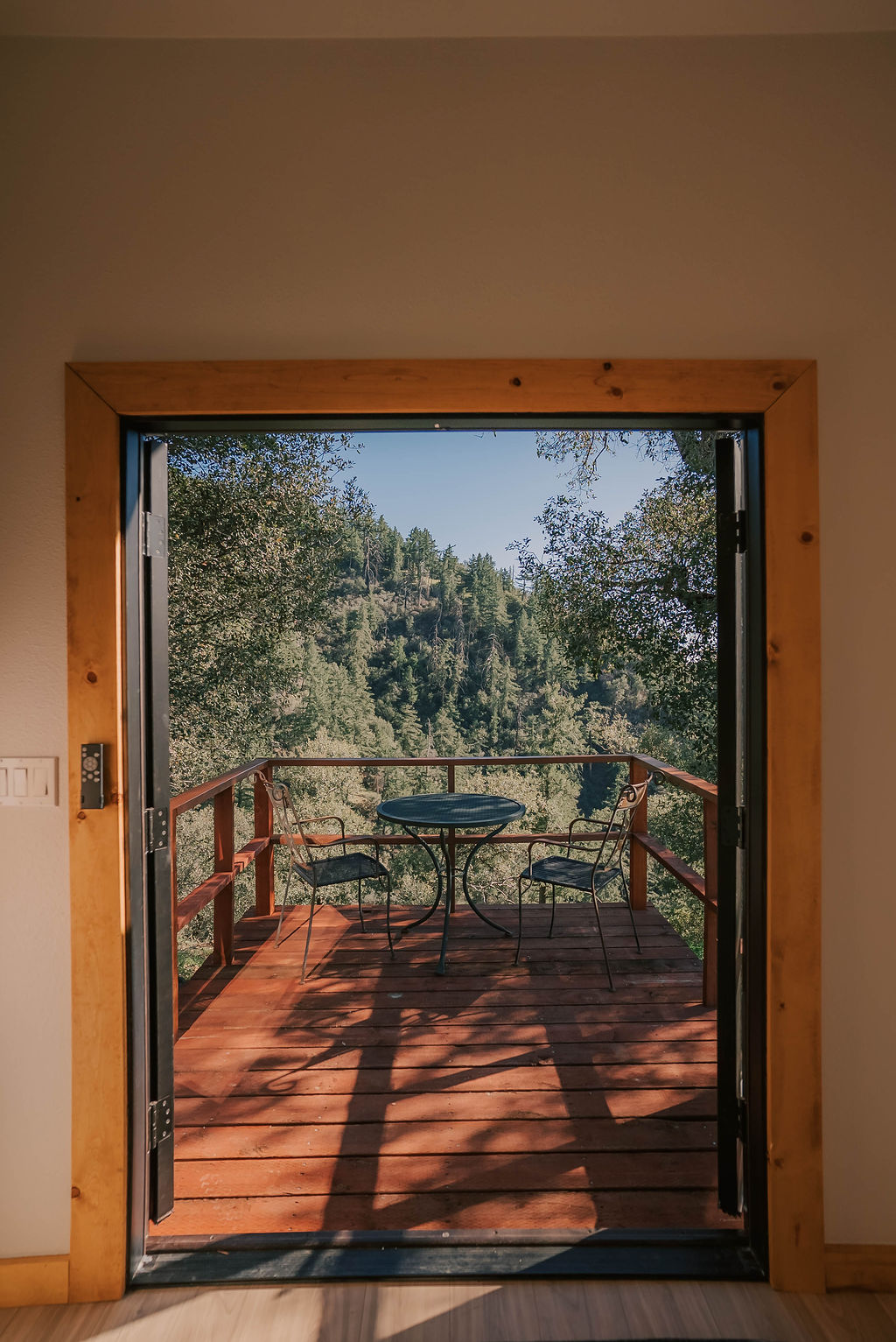 - Indoor-Outdoor Flow: Large glass-panelled double doors open wide to a private redwood deck, effectively doubling your living space and inviting the mountain breeze inside.